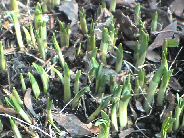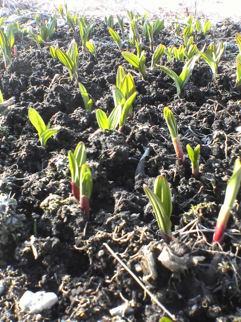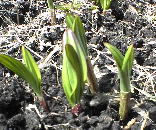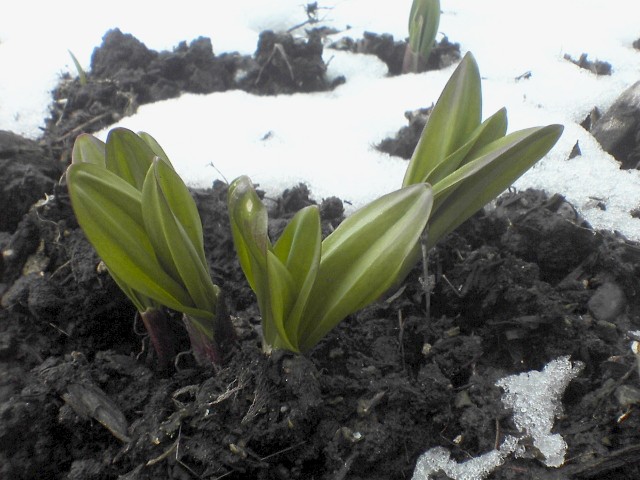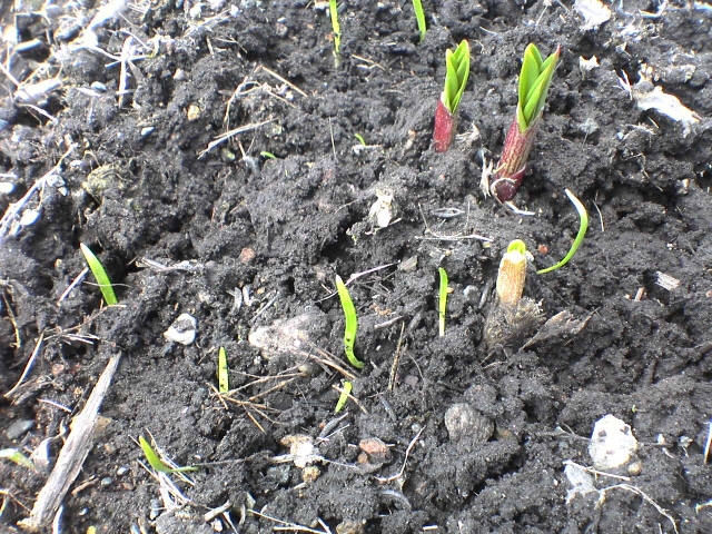 我が家のアイヌネギは、花壇の一角で栽培しているため日当たりも良く (通常は半日陰が良いと言われています)、自然に自生しているものより発育は早めです。
